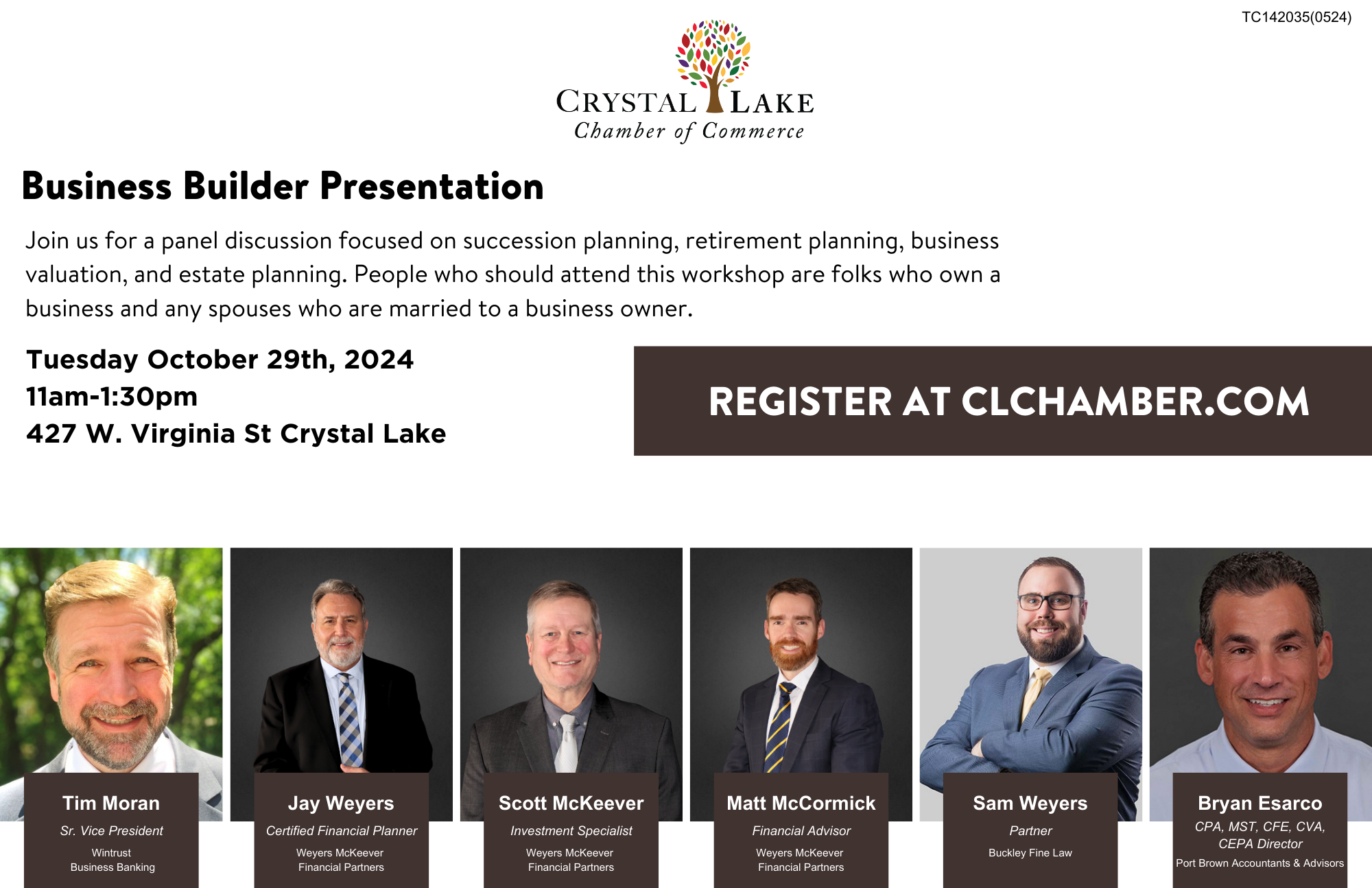 Join us for a panel discussion focused on succession planning, retirement planning, business valuation, and estate planning. People who should attend this workshop are folks who own a business and any spouses who are married to business owners.