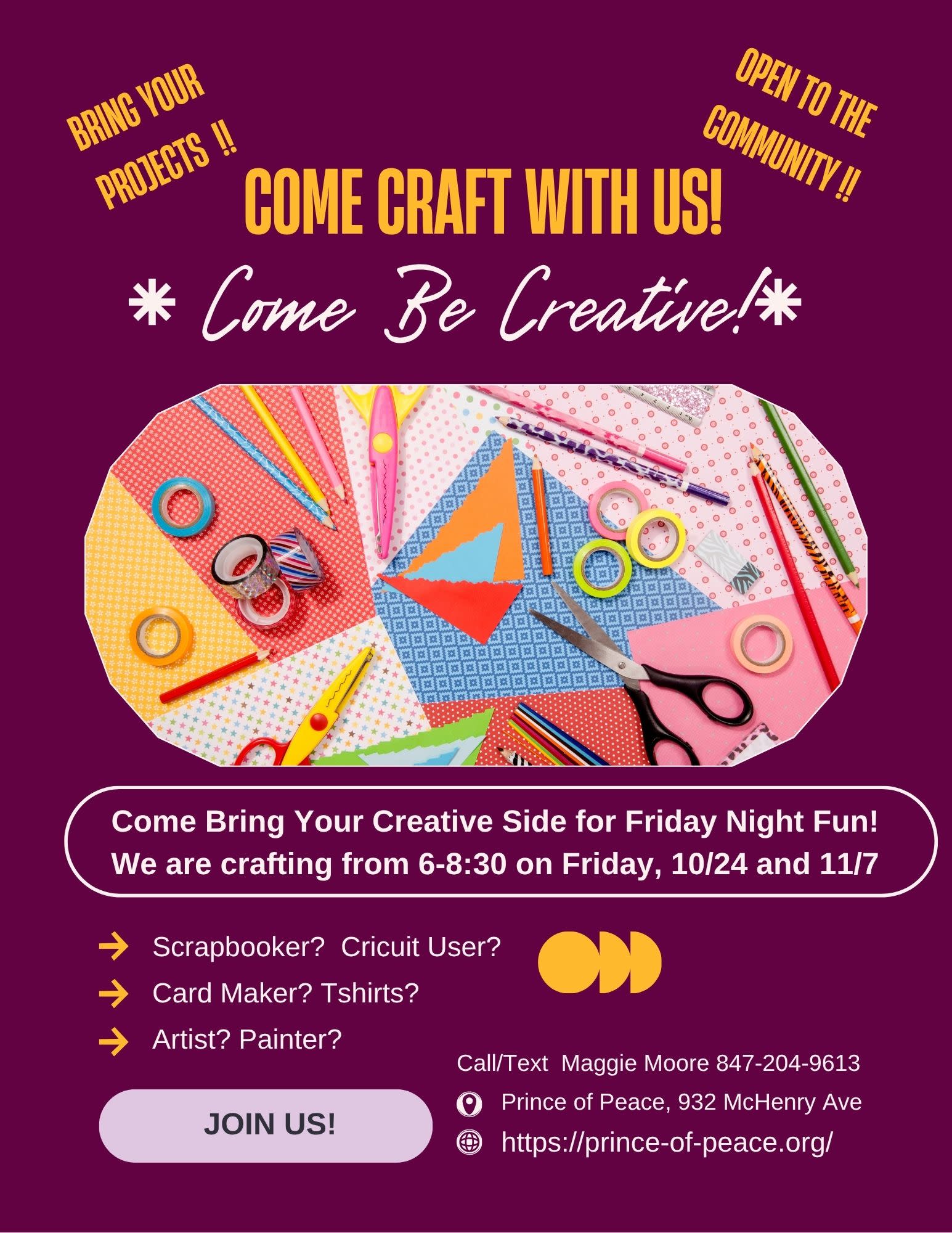 #CrystalLakeIL #CommunityEvents #CraftingCommunity #DIYNight #CreativeConnections #Quilting #Scrapbooking #Cardmaking #Knitting #MakersGonnaMake #CraftNight #FridayFun #PrinceOfPeaceChurch #CrystalLakeCreatives #LocalEvents #MeetCreateConnect