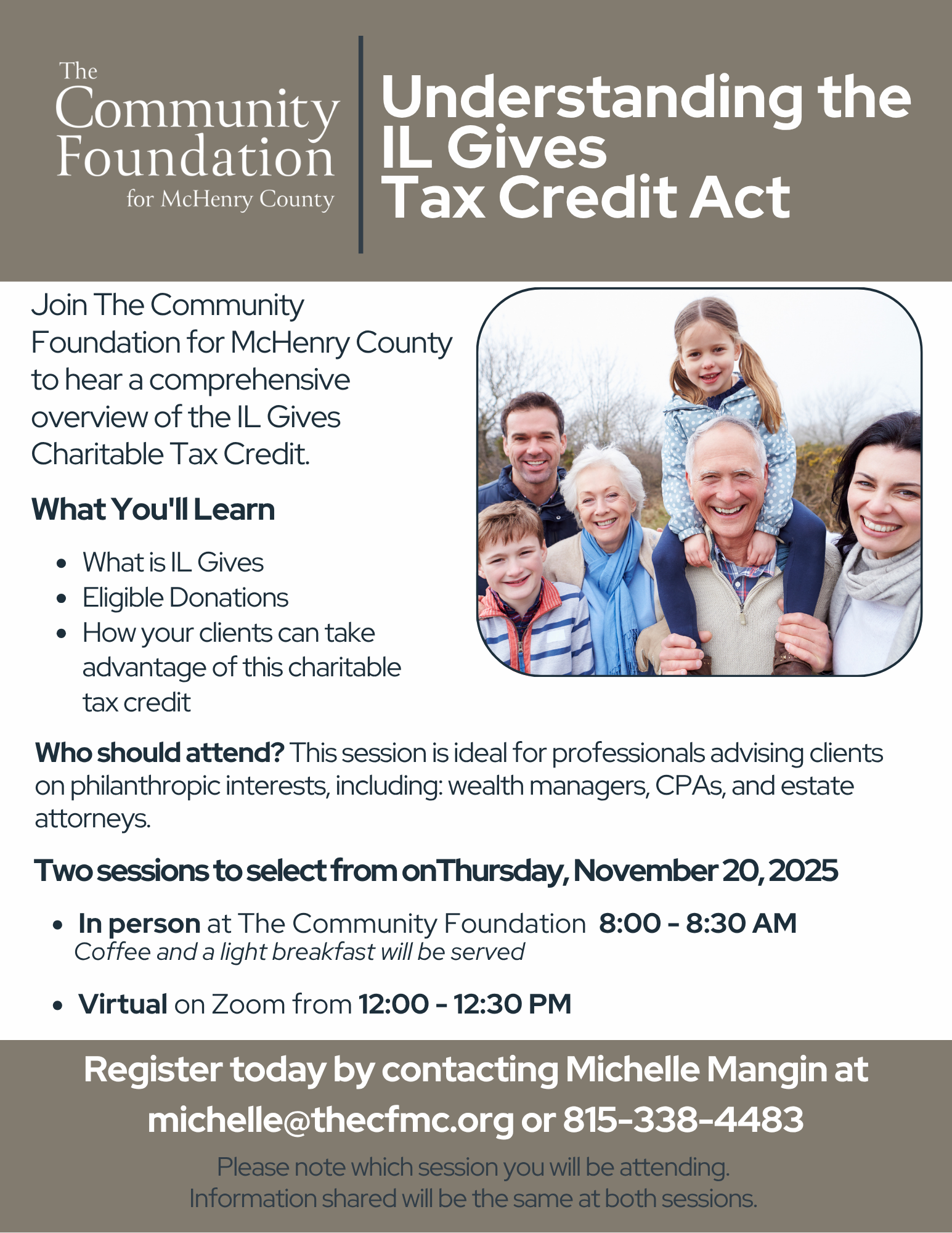 The Community Foundation for McHenry County is hosting an information session "Understanding the IL Gives Tax Credit Act" on Thursday November 20th.
