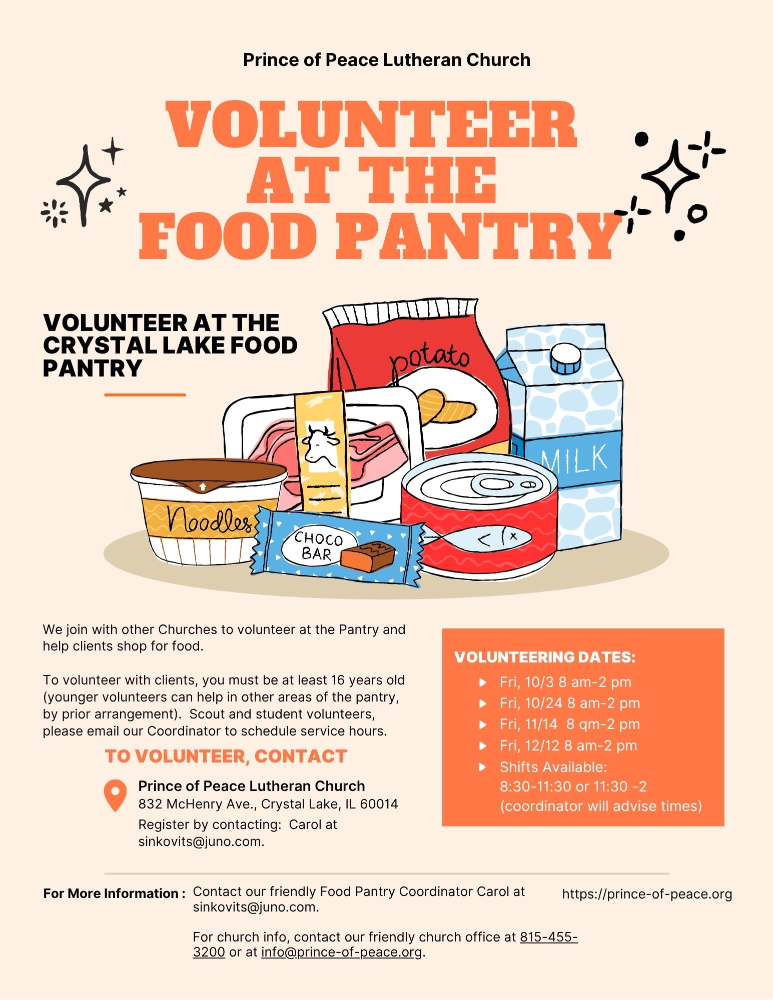 Join us in making a difference right here in our community! The Prince of Peace Church Team is volunteering at the Crystal Lake Food Pantry, and we’d love for you to join us—no church membership required.