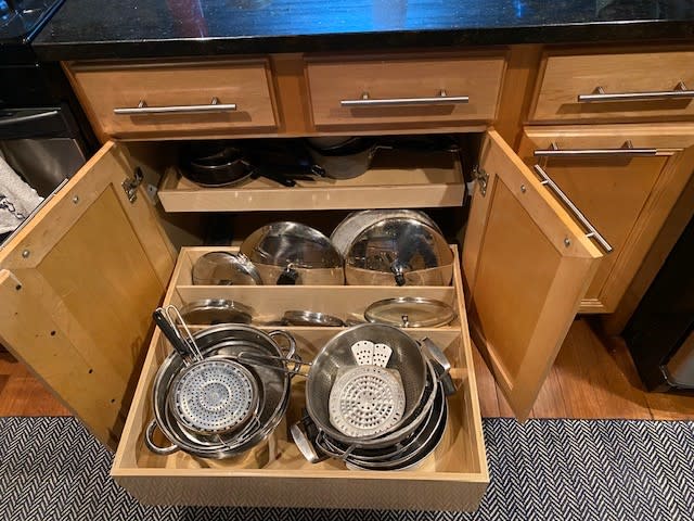 Custom pull-out shelves for existing cabinets, pantries and bathroom vanities.