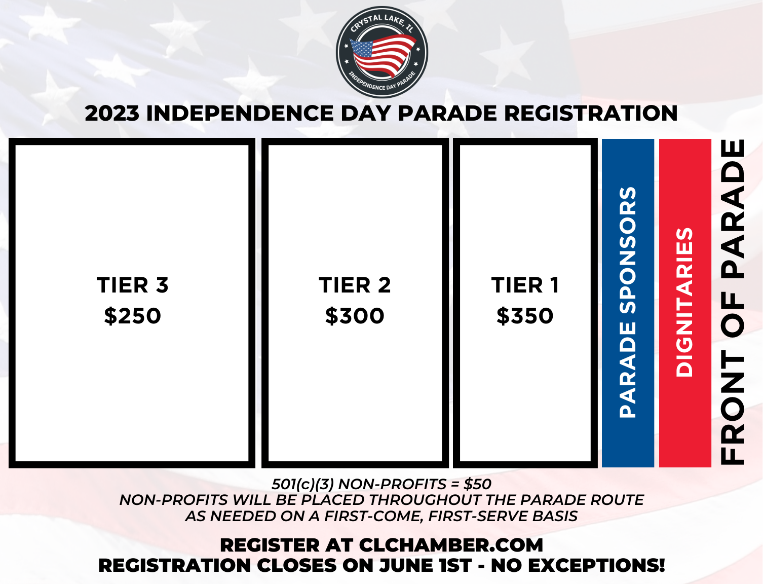 In order to participate in the Crystal Lake Independence Day Parade on Sunday, July 2, 2023, the Chamber will need the following from you: