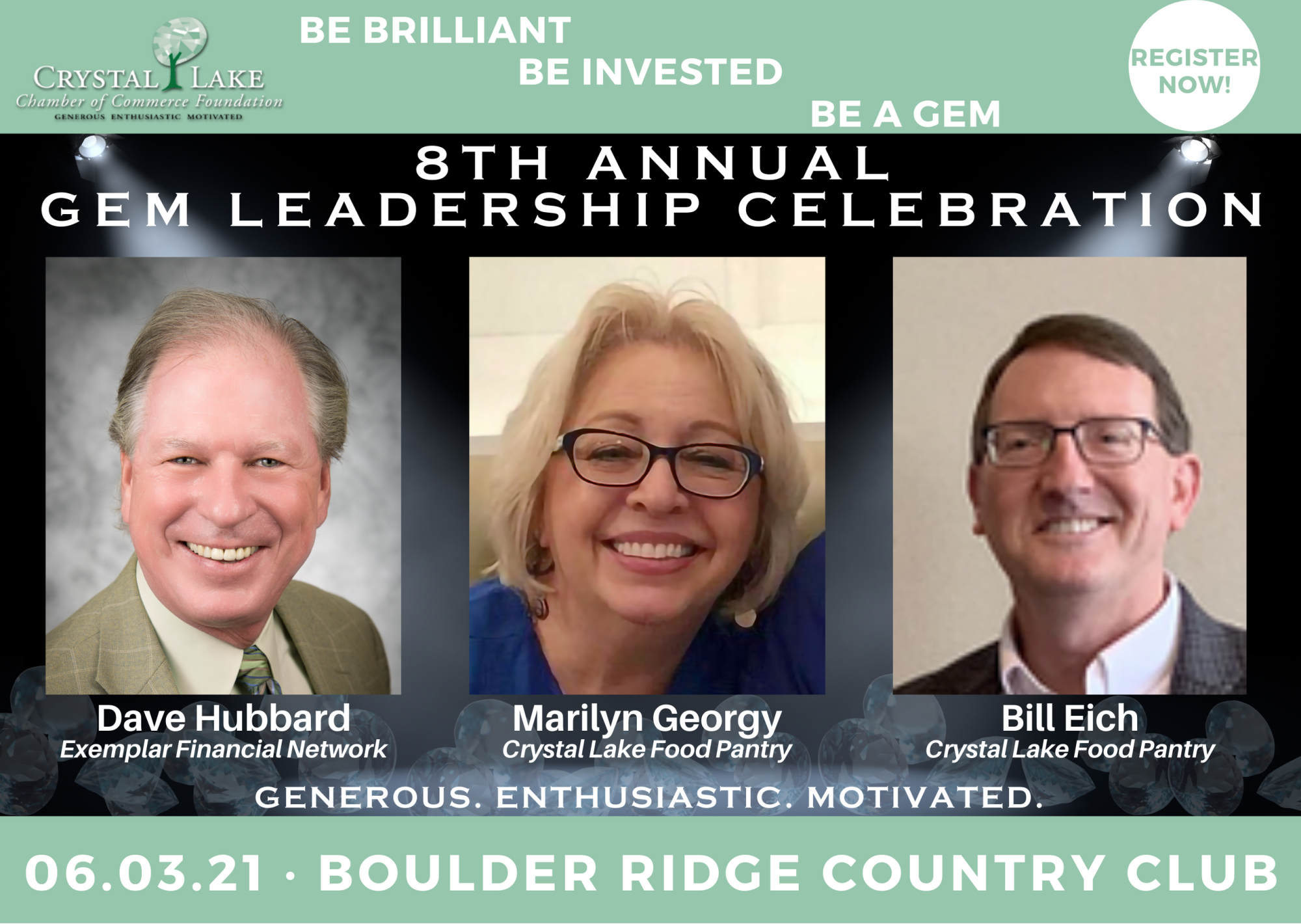 This year, the Crystal Lake Chamber of Commerce Foundation is proud to present GEM Leadership Awards to Dave Hubbard (Exemplar Financial Network), as well as Marilyn Georgy and Bill Eich, both of whom are being recognized for their work in leading the Crystal Lake Food Pantry.