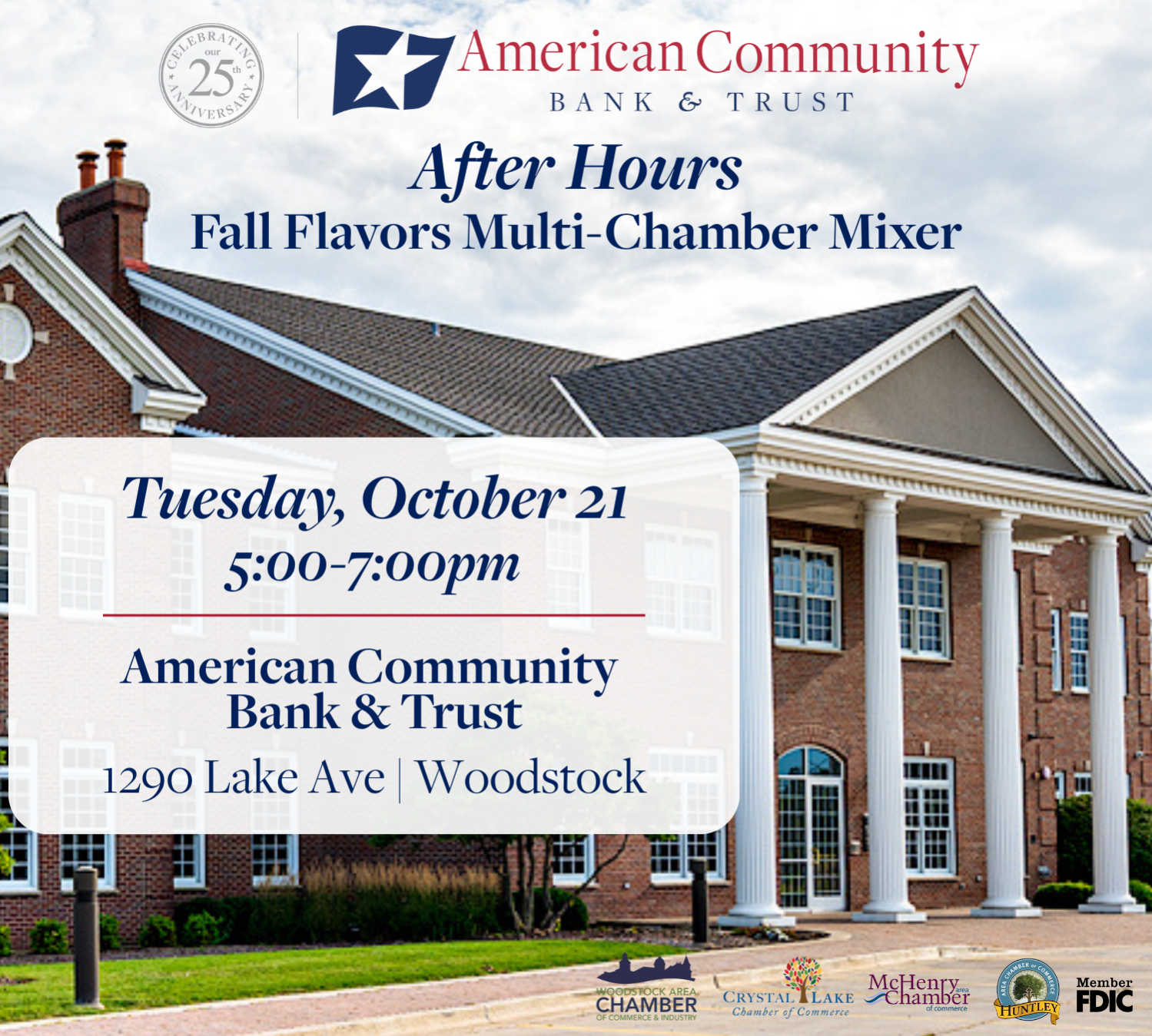 Discover what 25 years of building relationships looks like at American Community Bank & Trust's (tag) Multi-Chamber Mixer! Enjoy delicious fall-flavored bites and beverages while making valuable connections with fellow professionals. We look forward to seeing you there!