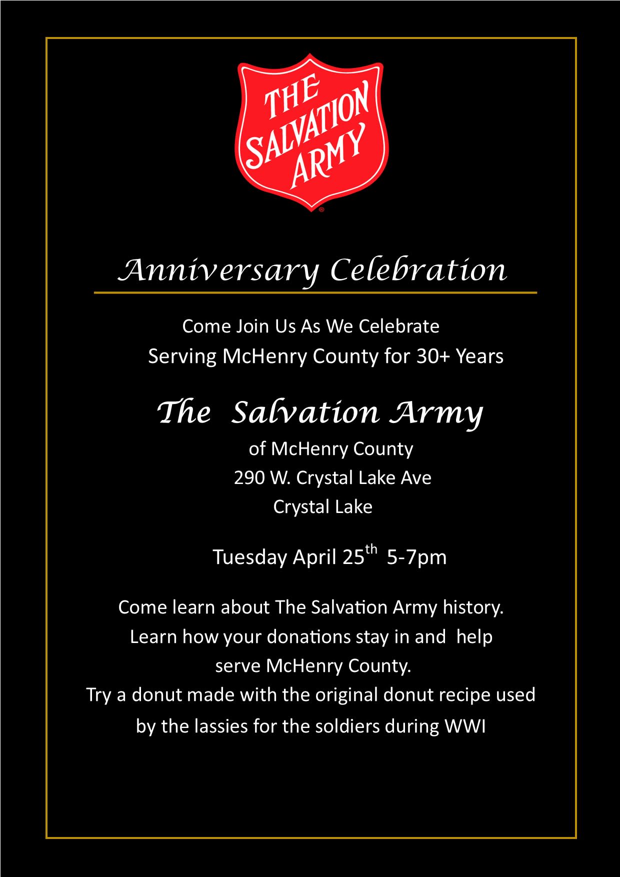Please join the Salvation Army and help them celebrate 30+ years serving McHenry County on Tuesday, April 25th from 5-7PM! There will be drinks and snacks available as well as photo opportunities with Captain Kettle and Captain Shield.