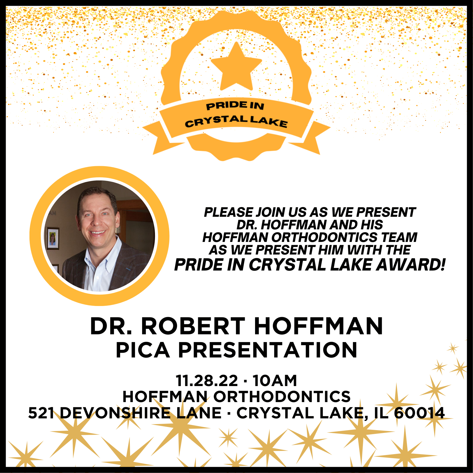Please join us as we present Dr. Hoffman and his Hoffman Orthodontics team with the Crystal Lake Chamber's P.I.C.A. (Pride In Crystal Lake Award)!