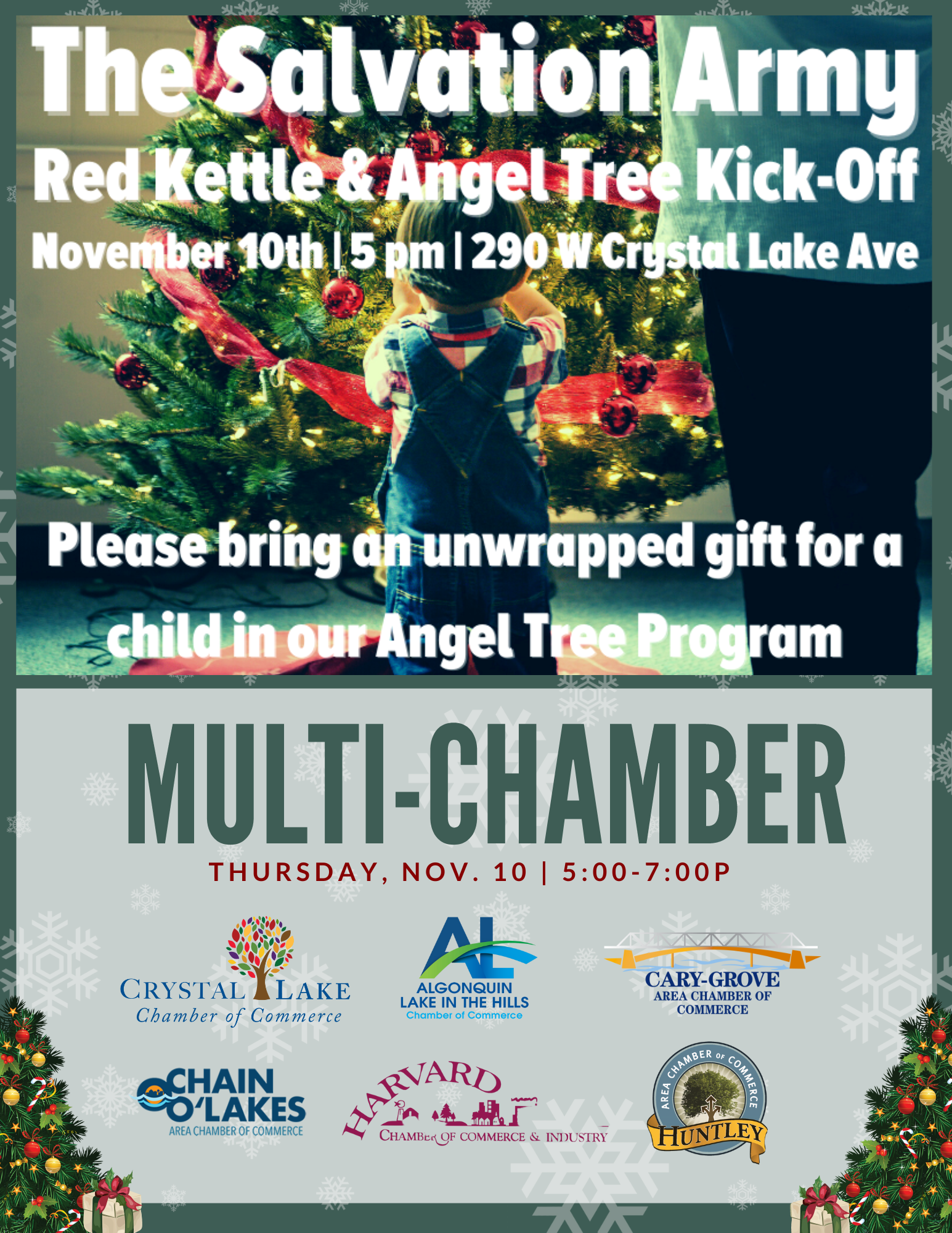 Please join us along with the Algonquin-Lake in the Hills, Cary-Grove, Chain O'Lakes, Harvard, and Huntley Chambers of Commerce for the Salvation Army annual holiday Red Kettle Kick-Off Mixer on Thursday, Nov. 10th from 5:00PM-7:00PM!