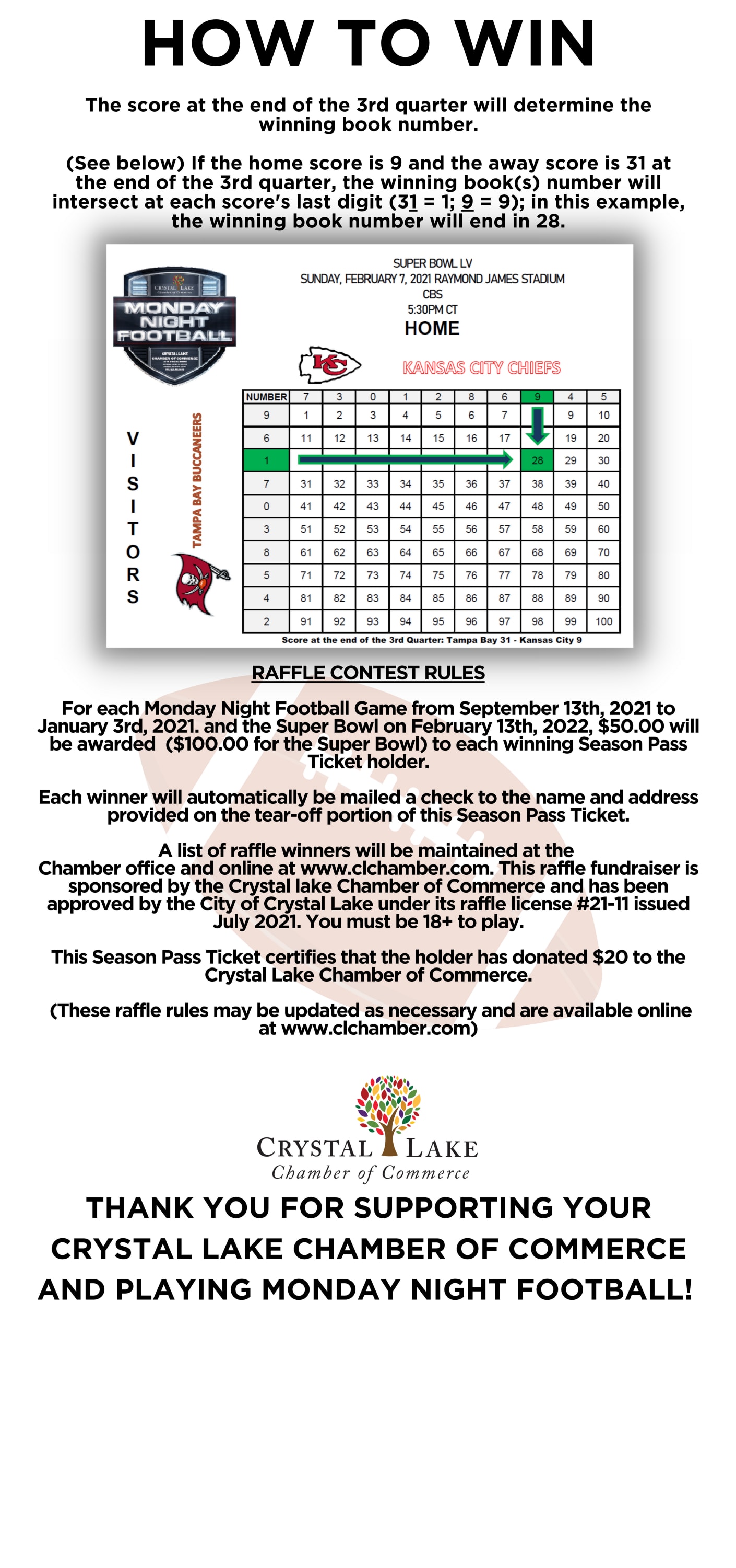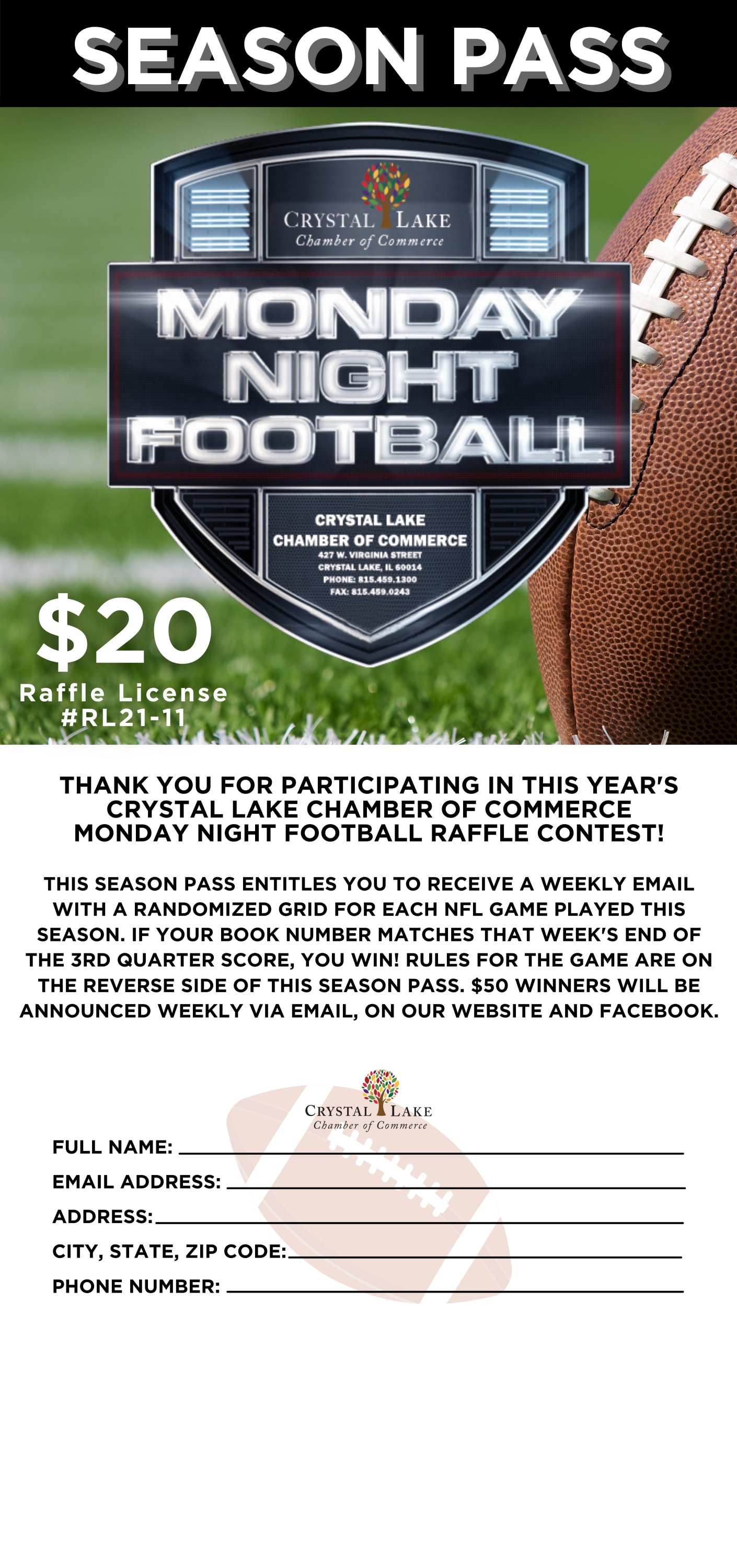 Welcome to the Chamber's Monday Night Football program! Once you purchase a Season Pass for $25 (or a 5-pack for $100), you are entitled to participate in each weekly contest throughout the season.