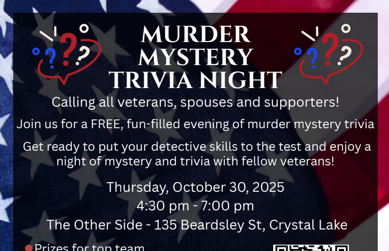 Get ready to put your detective skills to the test and enjoy a night of mystery and trivia with fellow veterans! Welcome to the Veterans Murder Mystery Trivia Night happening at The Other Side- 135 Beardsley St on October 30, 2025 at 4:30 PM (Central Time). Get ready for an evening filled with suspense, clues, and brain-teasing questions! Veterans, spouses and supporters welcome. Join us as we unravel the mystery together and put your detective skills to the test. It's the perfect opportunity to have fun, meet new people, and enjoy a thrilling experience. Don't miss out on this exciting event! Come solo or bring a team. Prizes for top team. Light snacks & refreshments provided. Event hosted jointly by veterans groups Veterans Network Assc, Crystal Lake American Legion and VFW. Event sponsored by Visting Angels, Assure Home Healthcare and Grand Victorian.