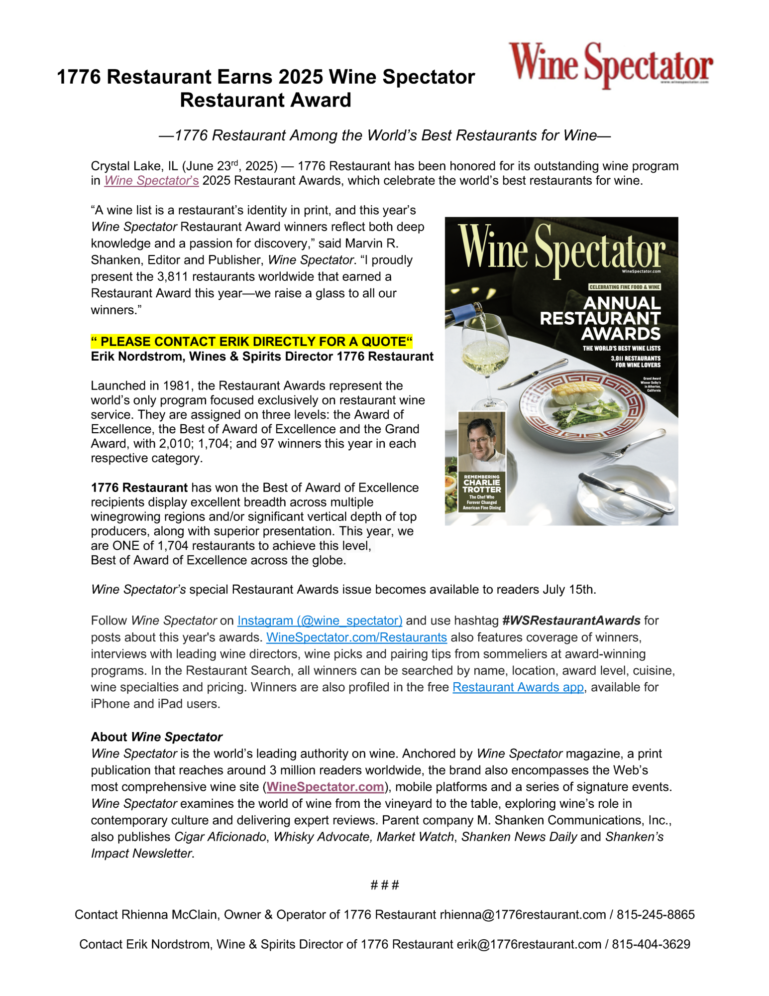 1776 Restaurant Earns 2025 Wine Spectator Restaurant Award Back to Member News/Press Releases 1776 Restaurant Earns 2025 Wine Spectator Restaurant Award By Rhienna McClain 6/23/2025 Images × Share × Email Facebook LinkedIn X Pinterest Powered By GrowthZone